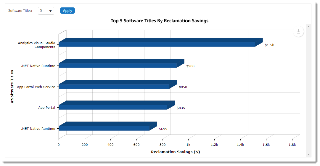 This graph displays the software titles that have generated the most reclamation savings over a specified time frame. To change the time frame, use the Select Time Frame drop-down list or the Start Date and End date fields as described in Choosing Time Frame for Graph Data.