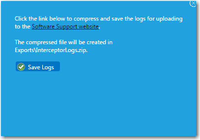 10. To save the log files in a ZIP file, so that it could perhaps be sent to product support personnel, click Save Logs. You are prompted to confirm the creation of a ZIP file which will contain a set of .csv log files.