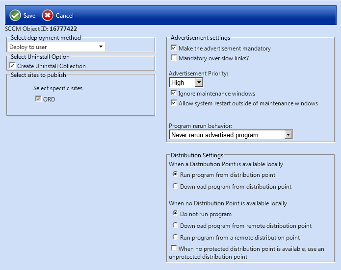 When creating a new catalog item using the New Software Catalog Item Wizard, you enter deployment settings on the ConfigMgr/SCCM 2012 Deployment Settings Panel or ConfigMgr/SCCM 2012 Package Deployment Settings Panel.