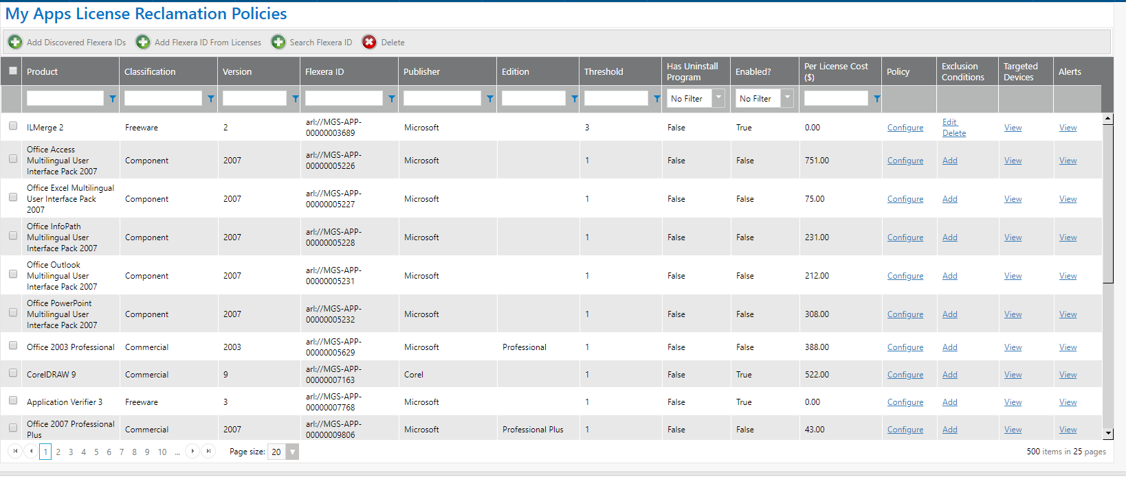 Add Discovered Flexera IDs —Click to view a list of all applications in the enterprise that have a Flexera ID identified.
