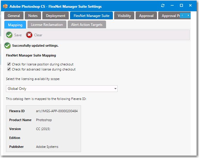 - Click Save. The catalog item is now mapped to a software entry in FlexNet Manager Suite, and the product information is now listed at the top of the dialog box.